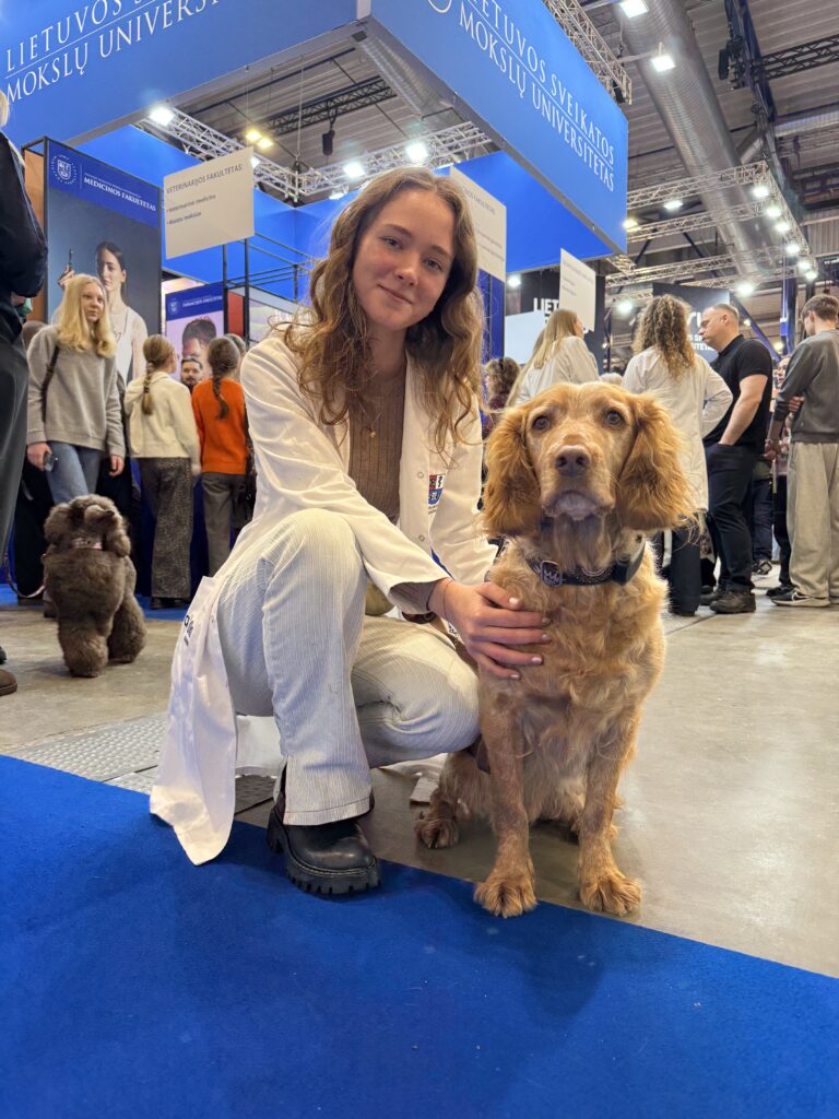 Kaip teigė Miglė Kisieliūtė, LSMU Gyvūno ir žmogaus sąveikos studijų programos antro kurso studentė į parodą atvykusi su keturkoje bičiule Ūdra, prieš kelis metus būtent studijų mugės metu atrado savo būsimą profesiją.