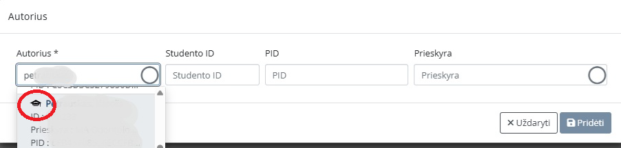 Write the surname of your supervisor in the line Vadovas, and select your supervisor from the list. Click Add.