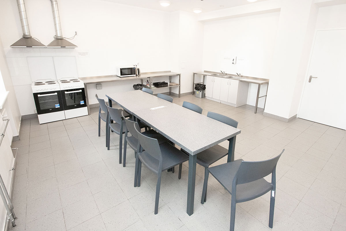 On each floor, there are two shared kitchens, each equipped with a stove (shared), a table, and a wardrobe for personal belongings. Wi-Fi is available throughout the dormitory.