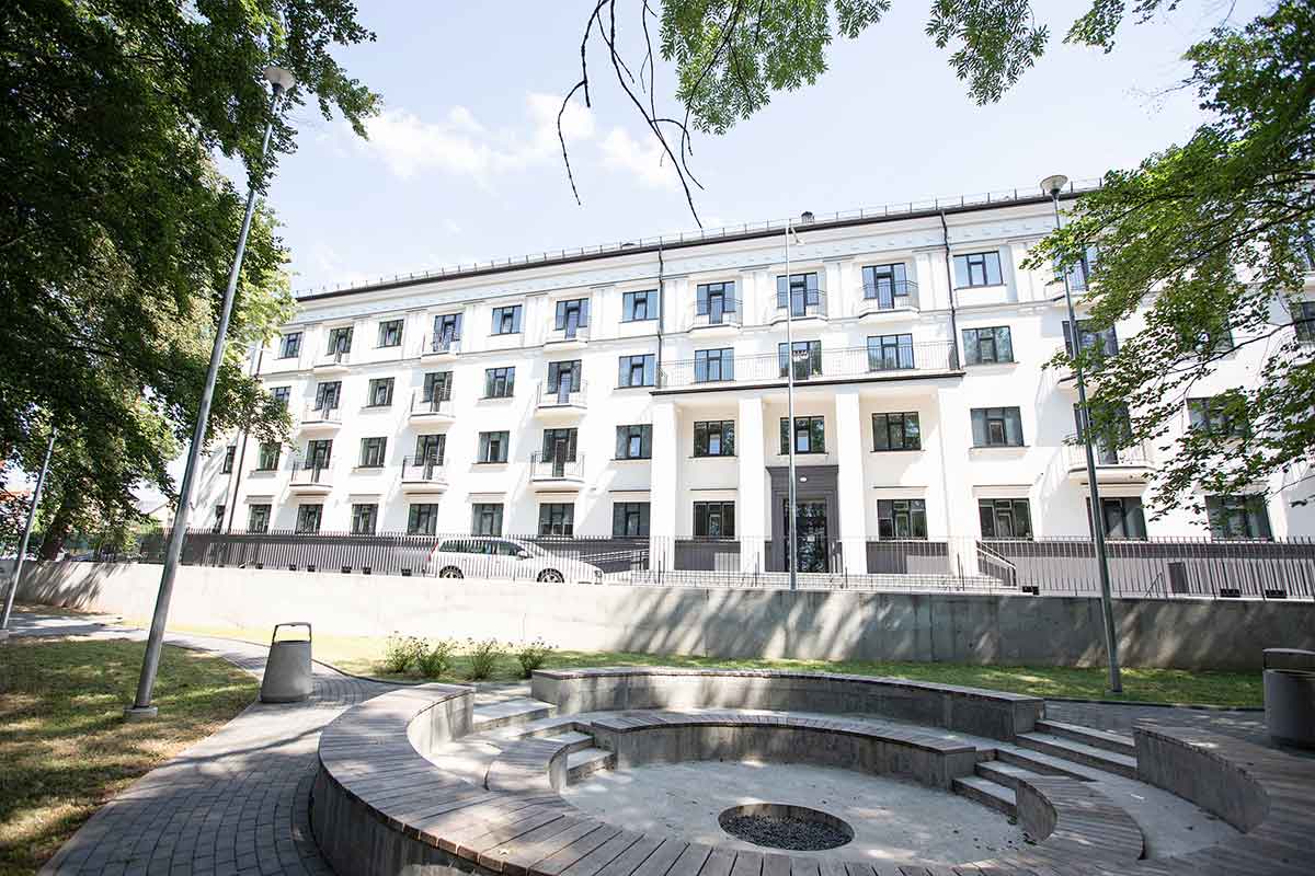 Located at Dainavos Street 3, Kaunas, on Žaliakalnis Hill, near the Kaukas Stairs, one of the most beautiful and quiet districts of Kaunas. It takes approximately 15 minutes to walk to the Central Building of the Medical Academy (A. Mickevičiaus Street 9, Kaunas) and about 10 minutes on foot to reach a shop or a bus stop.