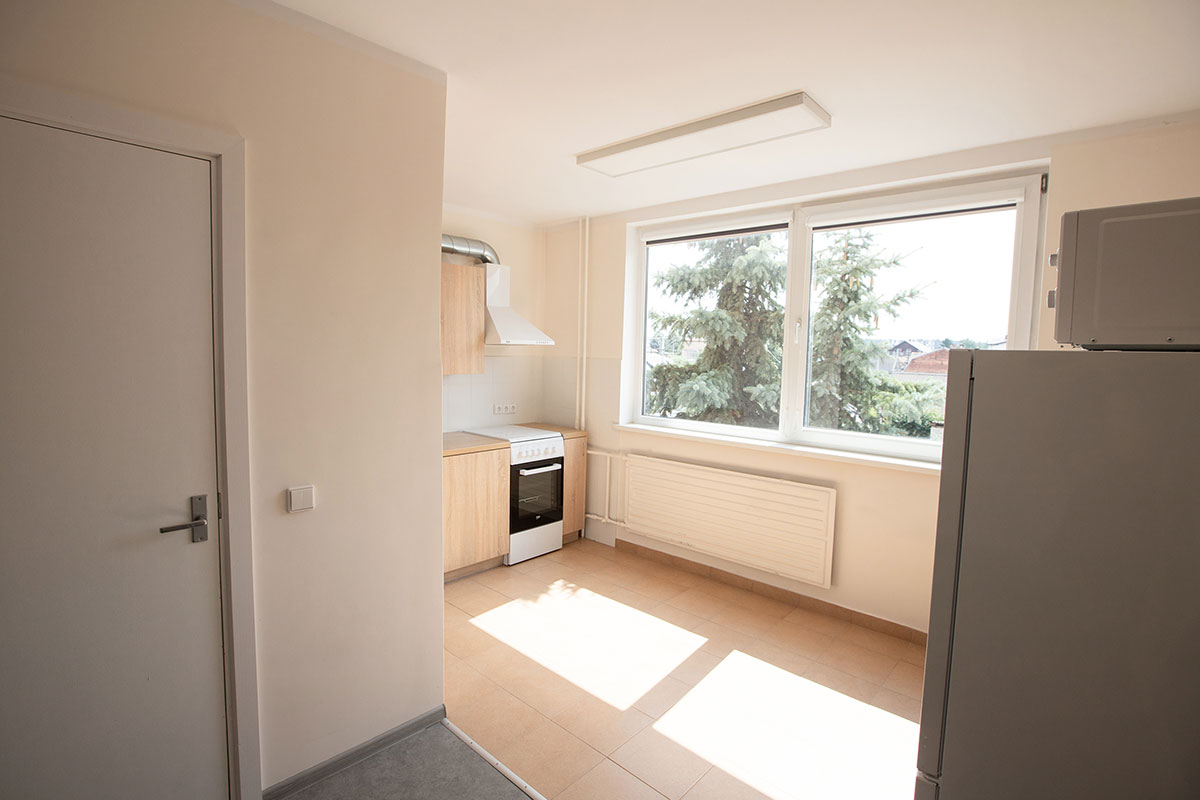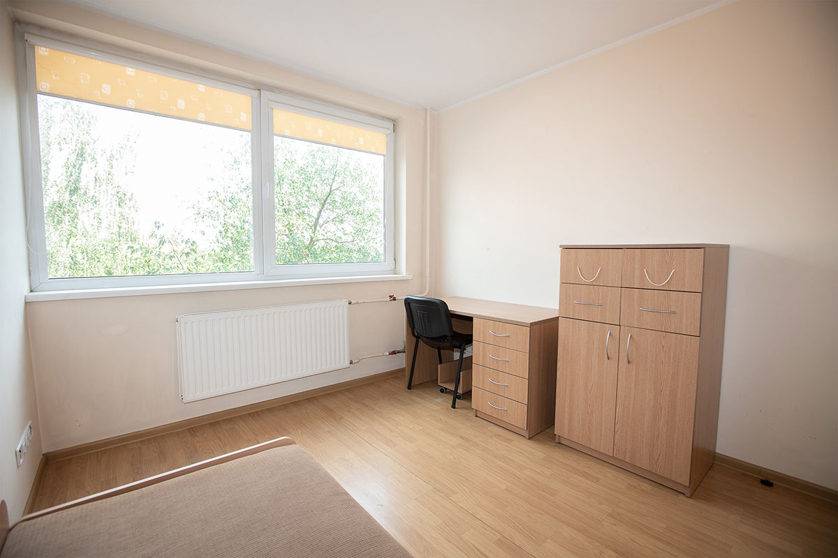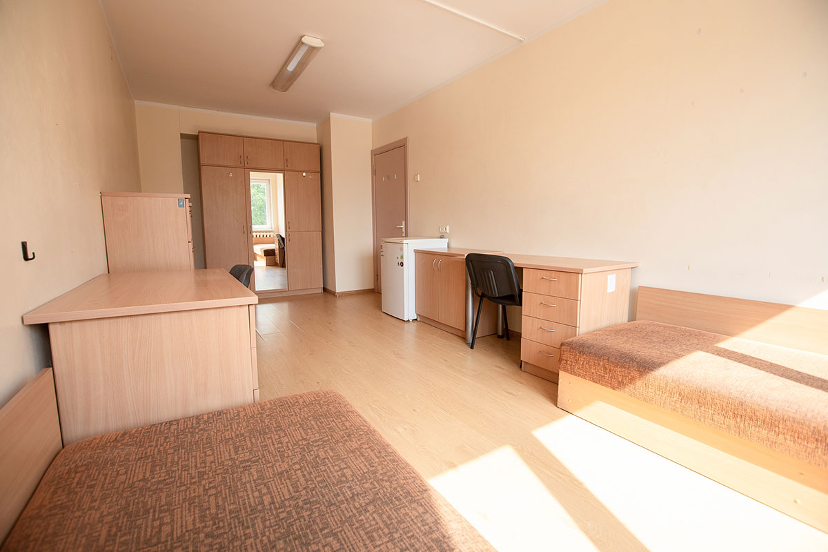 Situated at Radvilų Dvaro Street 33, Kaunas, in close proximity to the Veterinary Academy and the Faculty of Public Health. Each dormitory room is furnished with a bed, wardrobe, fridge (either in the room or in a shared kitchen), desk, pillow, blanket, and bed linen. All rooms are designed for double occupancy by individuals of the same gender. The price for a spot in a room ranges from 101 to 144 EUR, depending on the quality and size of the room.