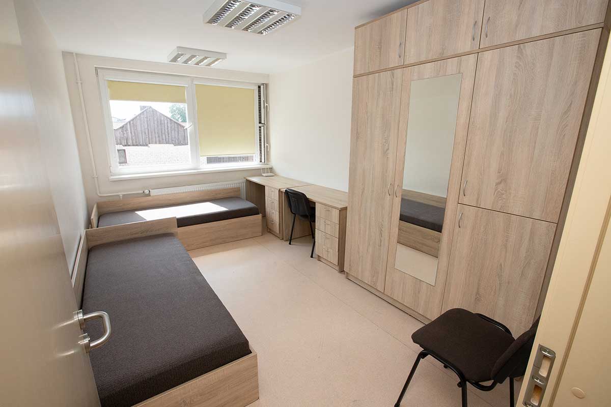 The dormitory room is equipped with a bed, wardrobe, fridge, desk, pillow, blanket, and bed linen. All rooms are shared by two individuals of the same gender. There are also washing machines and clothes dryers available. The monthly price ranges from 150 to 250 EUR per person, depending on the quality and size of the room. Additionally, there is a bed linen rental fee of 40 EUR per year and a parking space fee of 20 EUR per month.