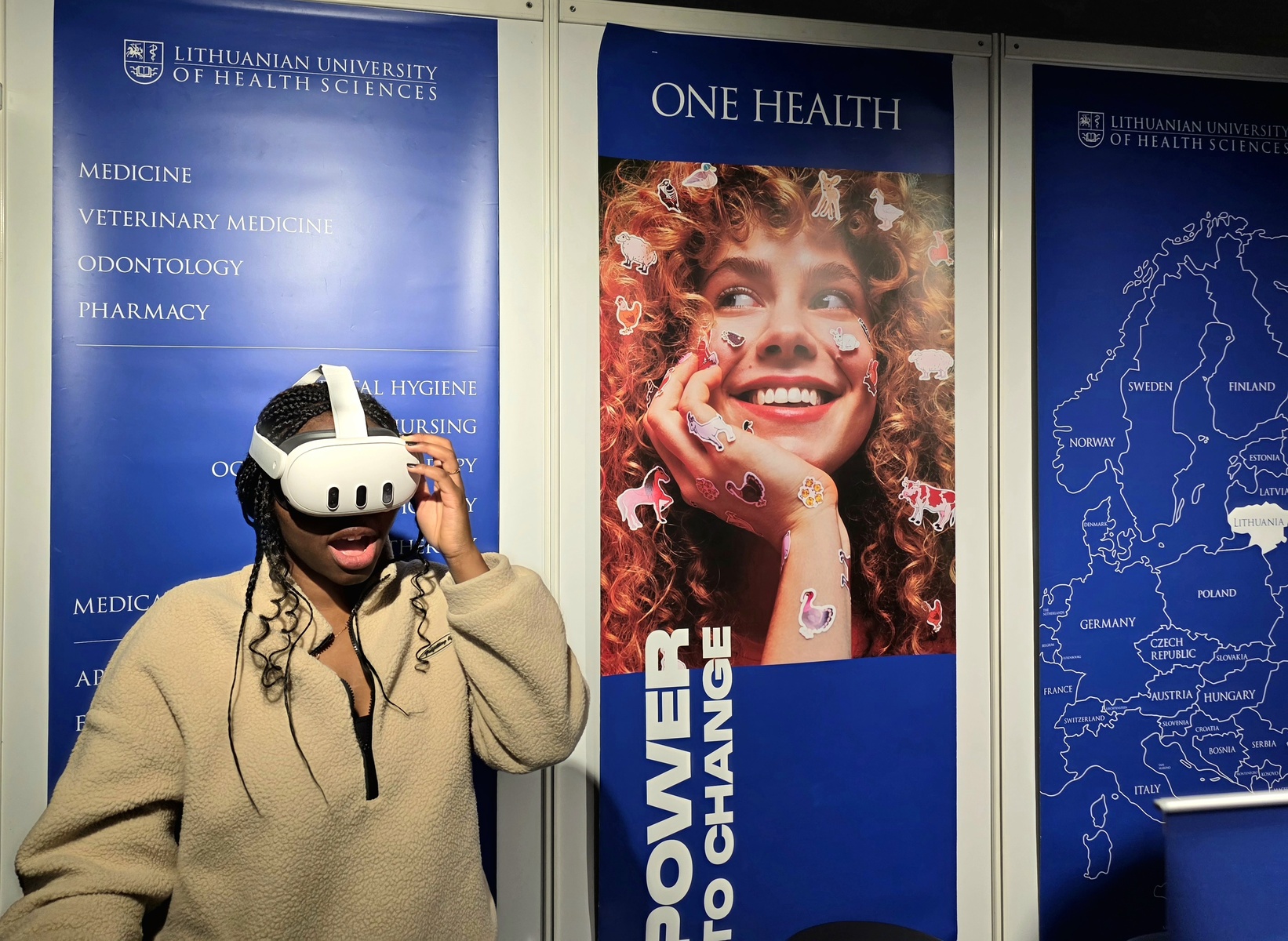 The virtual reality (VR) glasses project, initiated by the International Relations and Study Centre of LSMU, attracted significant attention. With the help of VR technology, students could “visit” university laboratories, the Medical Simulation Centre, lectures, operating rooms, and student leisure spaces. This immersive experience allowed them to see the study environment up close and to feel as if they were already part of the LSMU community.