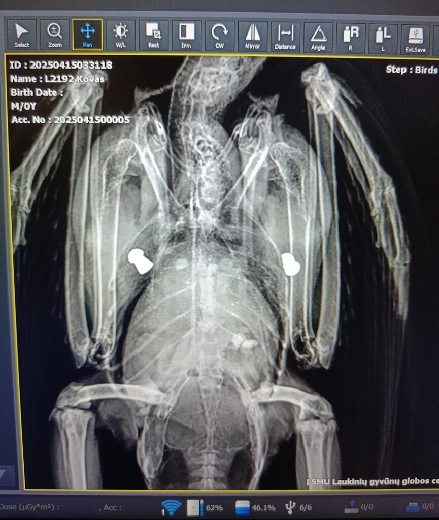 „Pernai balandį į centrą pateko kovas (Corvus frugilegus), kurio kūne rentgeno tyrimo metu aptikome du pneumatinio ginklo šovinius. Jie buvo įstrigę ties šonkauliais, šauta iš dviejų skirtingų pusių. Šovinius pašalinome chirurginiu būdu, tačiau paukštis neišgyveno. Tikėtina, kad be mechaninių pažeidimų, prisidėjo ir švino toksikozė“, – pasakojo LGGC veterinarijos gydytojas Rokas Matevičius.