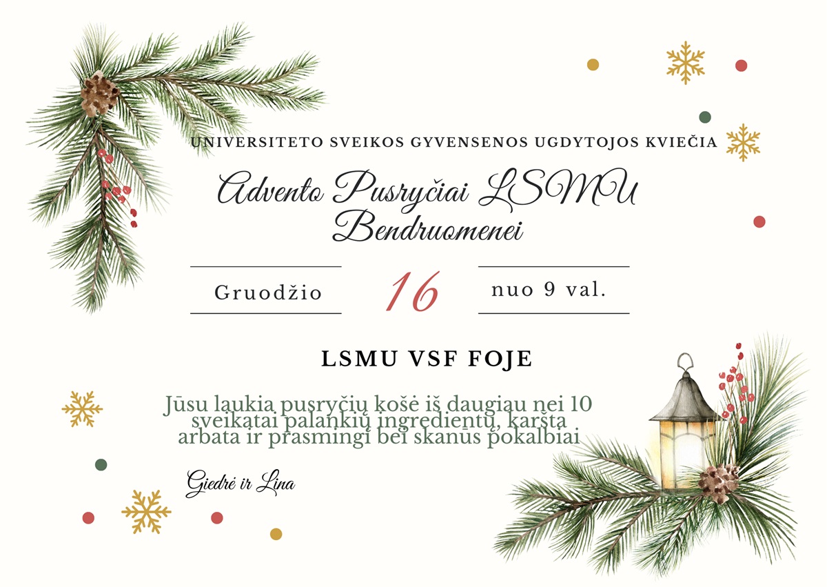 LSMU sveikos gyvensenos ugdytojos kviečią visą LSMU bendruomenę prieškalėdiniu laikotarpiu susitikti pusryčiams, akimirkai sulėtėti prieš artėjančias šventes ir jaukiai bei prasmingai pradėti dieną.