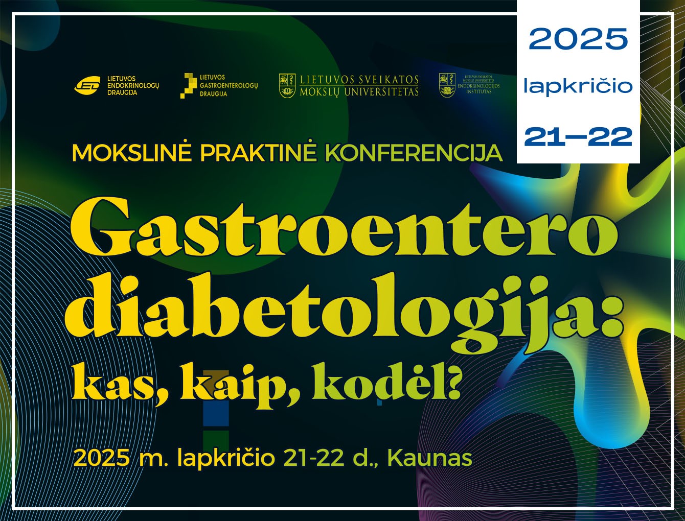 Lietuvos endokrinologų draugija, Lietuvos gastroenterologų draugija, Lietuvos sveikatos mokslų universitetas ir Lietuvos sveikatos mokslų universiteto Medicinos akademijos (MA) Endokrinologijos institutas organizuoja mokslinę-praktinę konferenciją „Gastroentero-diabetologija: kas, kaip, kodėl?“.