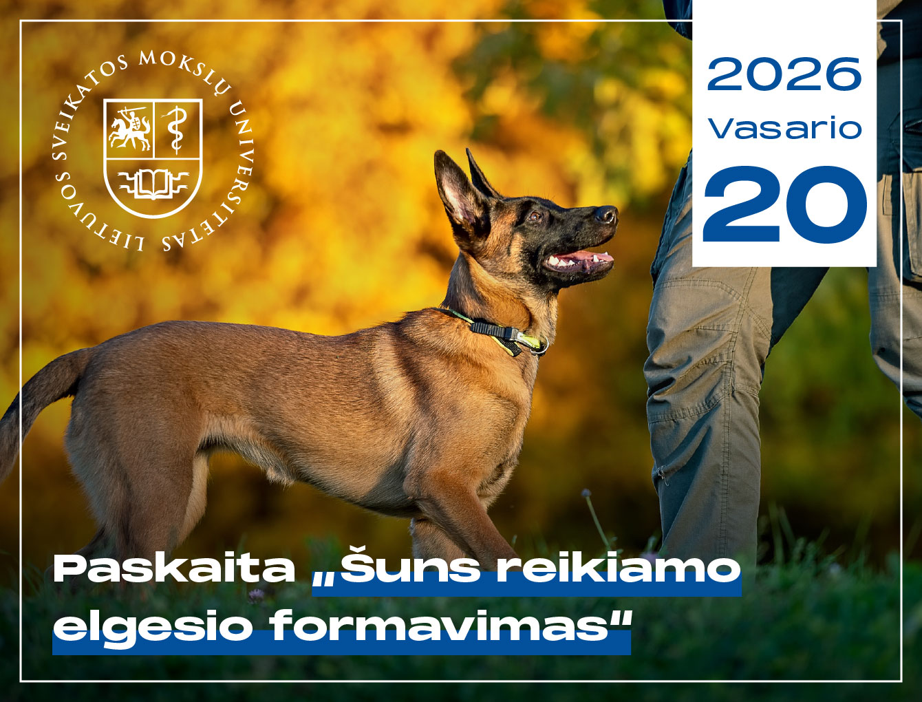 2026 m. vasario 20 d. (penktadienį) 8:30 val. LSMU Gyvūnų mokslų fakulteto Kinologijos centras kviečia studentus ir bendruomenės narius į išskirtinį renginį, kurio metu svečiuosis Lietuvos kalėjimų tarnybos Specialiųjų kompetencijų ugdymo ir kinologijos skyriaus specialistas, LSMU Gyvūnų mokslų fakulteto Kinologijos centro K-9 sekcijos pirmininkas Rolandas Eidininkas.