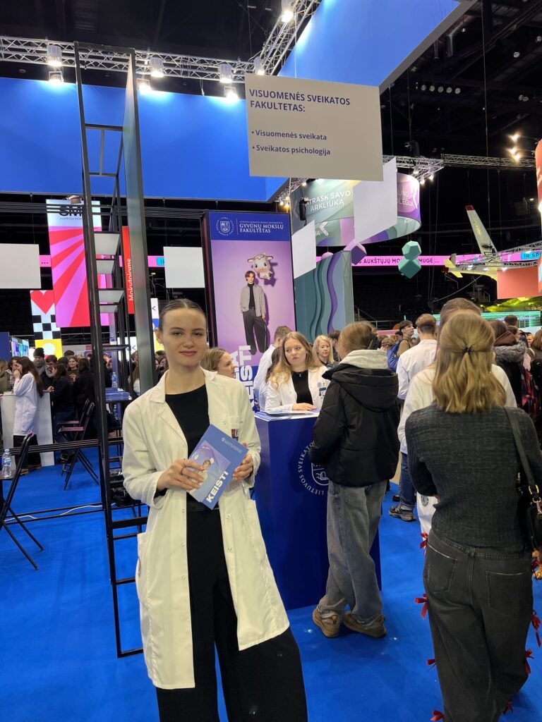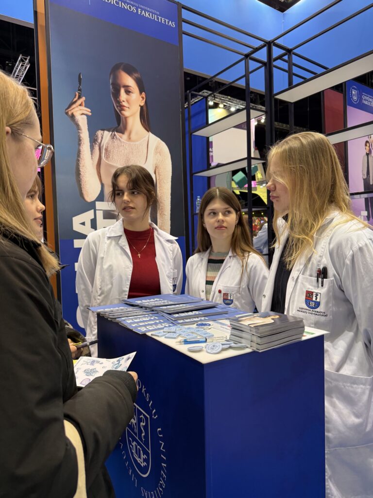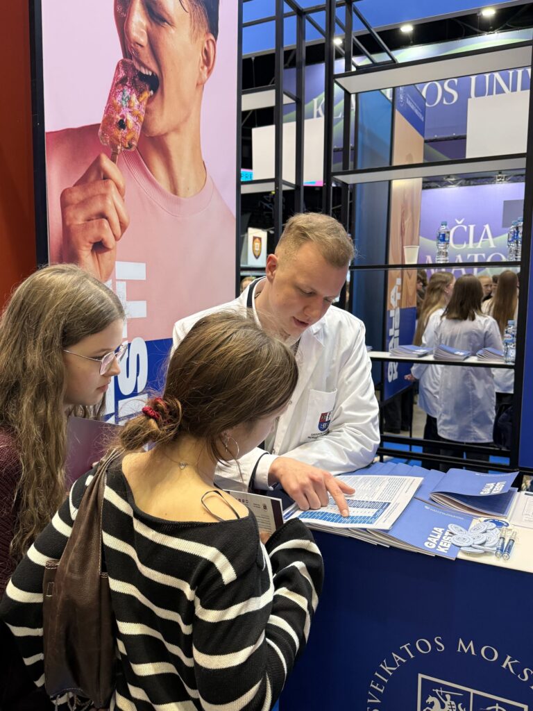 LSMU stende, kuriame įsikūrė Universiteto dėstytojai, studentai bei darbuotojai, susirinkę moksleiviai daugiausia domėjosi apie studijų kelią – kokie yra priėmimo reikalavimai, kaip organizuojamas studijų procesas ir kokios profesinės galimybės atsiveria baigus studijas.